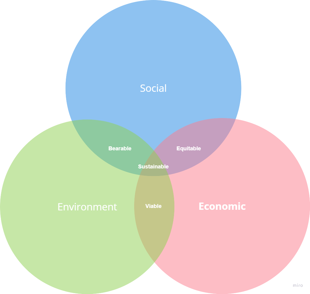 When the 3 concentric circles are formed into a ‘Venn’ diagram, their interdependency gives rise to the notion that sustainability involves the intersection of the three pillars namely the environment, the society and the economy. Alternatively, the interdependency of the pillars can give rise to another notion of sustainability involving four elements, including equity, viz: equitable, bearable, sustainable and viable. Your paper mentioned equity as a component of sustainability.